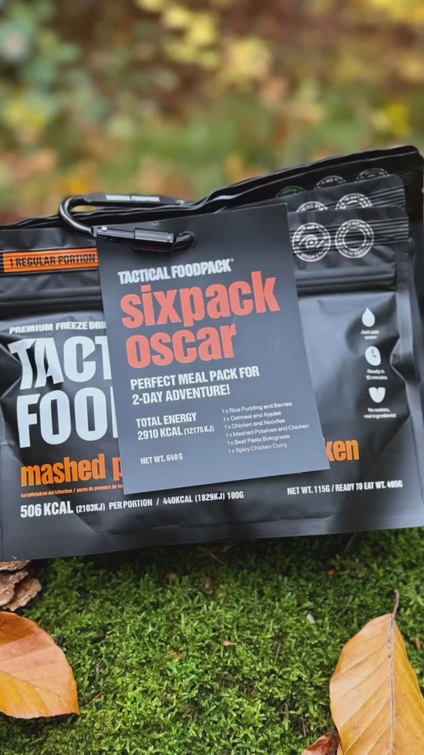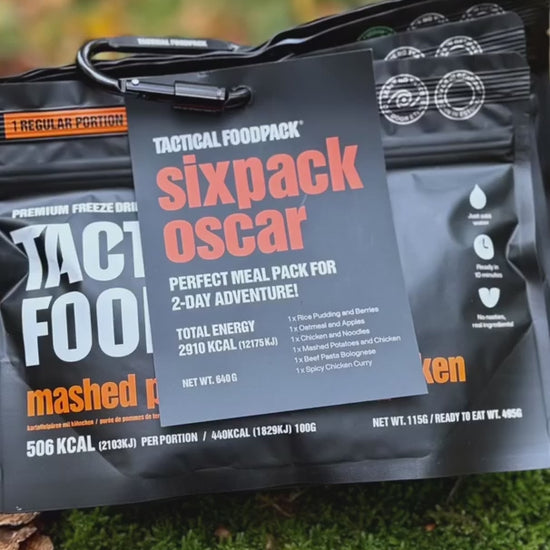 El Sixpack Oscar de Tactical Foodpack es el kit de supervivencia definitivo para quienes no se conforman con lo básico. Diseñado para alimentar a un adulto durante 48 horas, este pack incluye 6 comidas completas (4 almuerzos y 2 desayunos) elaboradas con ingredientes naturales y sin conservantes artificiales.